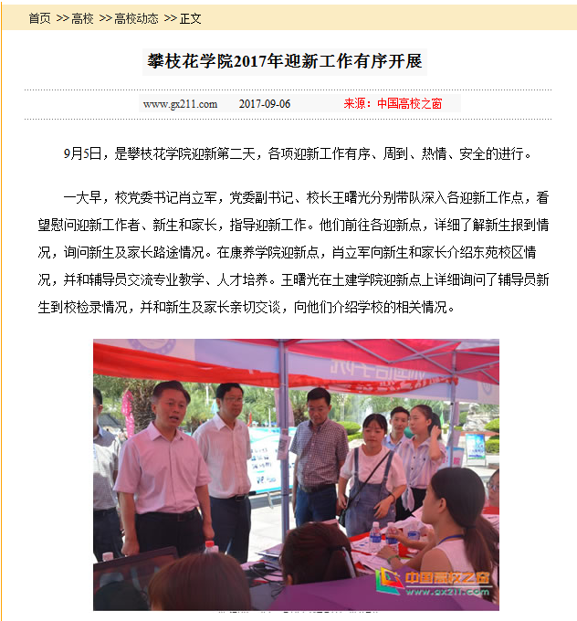 为及时、集中、快速报道学校迎新情况,学校传媒中心通过校园新闻网、官方微信、广播电视以及“一直播”网络直播等平台开展了“2017•以心迎新”系列报道,消息受省市媒体关注。四川新闻网、四川省教育厅四川教育网和中国高校之窗等网络平台相继转发报道了taptap点点迎新工作;《攀枝花日报》分别于9月6日、8日报道taptap点点迎新、开学典礼等情况,攀枝花市电视台于9月5日对taptap点点康养学院迎新情况进行了专题报道。